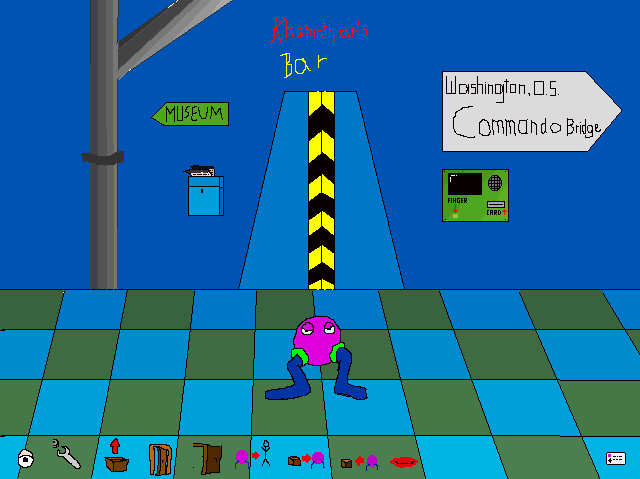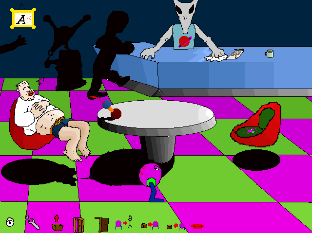 I have always been a point & click adventure game fan, so I had to try creating my own grand adventure of course! I got as far as creating two screens. In this unnamed adventure, you could “walk” the purple alien ball called Mutlogg around with the cursor keys (more like warping around, since the collision detection didn’t work at all) and even talk to the alien bar keeper (with voice talents by my brother and yours truly.) Most of the characters on screen were animated however, even all the interface buttons had two different states. Apparently the story revolved around some kind of murder case, but I think I just made that up as I went along creating the “game.”