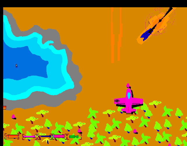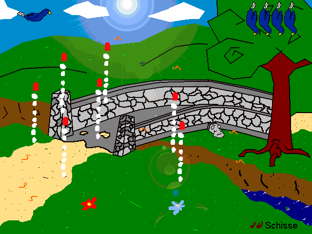 Here comes Operation Werewolf – oder der harmlose Handschuh. Well, at least I was admitting I couldn’t draw worth a damn, considering that sock puppet in the logo was supposed to be a wolf.  I was actually surprised how far I got in this game. After the obligatory main menu (complete with the US national anthem in the background, hummed by myself) there’s a weapons shop that actually works. You can even view your aircraft, the “Stealth Attackbomber XSA1 – Prototype.” Yea, whatever. The next screen gives you a short briefing on the mission by a “Commander Fox,” commanding you to show the terrorists “what a pepperoni is.” WTF! Clicking on the silly “Get ’em” button lets you actually take off in your pink jet plane and fight a helicopter! Well, not really, since everything is really buggy and the helicopter just disappears after like one second. But still, you can fly around for about two screens. And, hey, there’s an animated shark in the water!